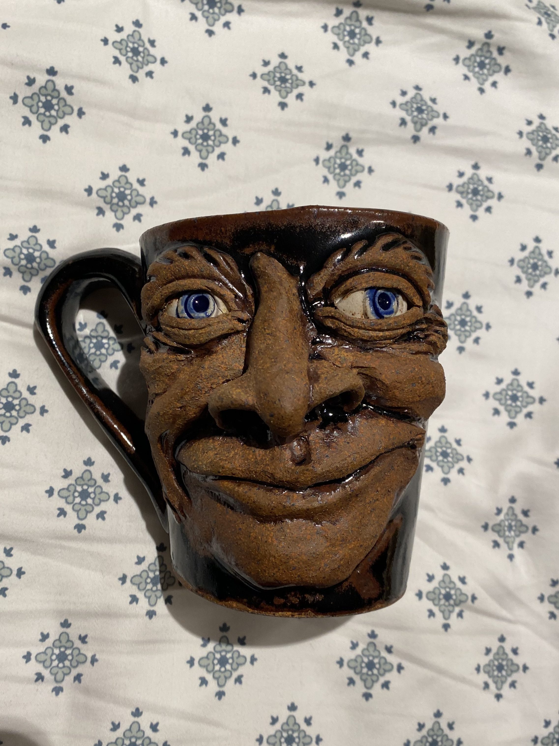I love pottery! I made a fair amount in middle school and practiced over a few high school summers, when such classes were fairly accessible. I loved making, particularly, themed sets of cartoonish elephants and dragons, but I also dabbled in bowls and mugs. My teacher through almost all of this was a wonderful, loving, patient woman named Sue. She did not make the above mug—but she loved putting expressive human faces on odd things (particularly insects), so this mug, found at a local farmer’s market, warmed my heart and brought me back.