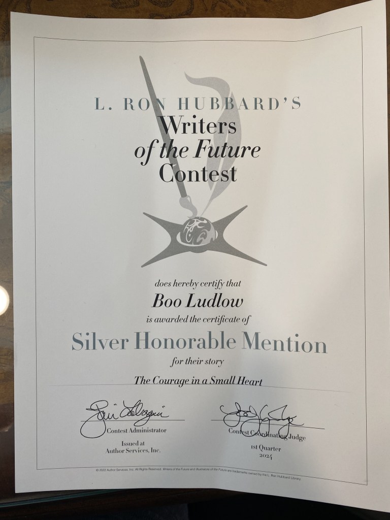 Unrelated to Niko’s review, I finally received a certificate documenting my silver honorable mention at Writers of the Future: