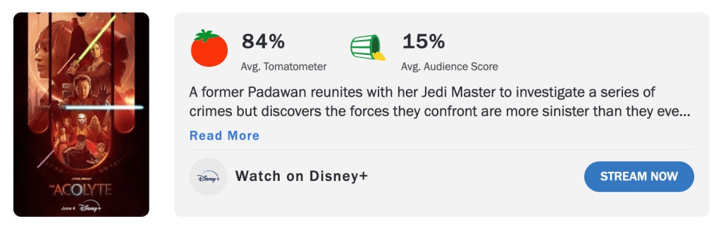 Audience scores for The Acolyte were 15% on Rotten Tomatoes. And Disney continues to blame fans for the objective failure this series then the numbers suggest this is something the fans clearly aren’t interested in. Wild. No amount of critical praise will recoup soured relations and trust with your fanbase. Even of looking at it from the most cynical perspective possible, who is going to buy your stuff if you tell them all that they are awful for not buying your stuff? No one, in a free market anyway.