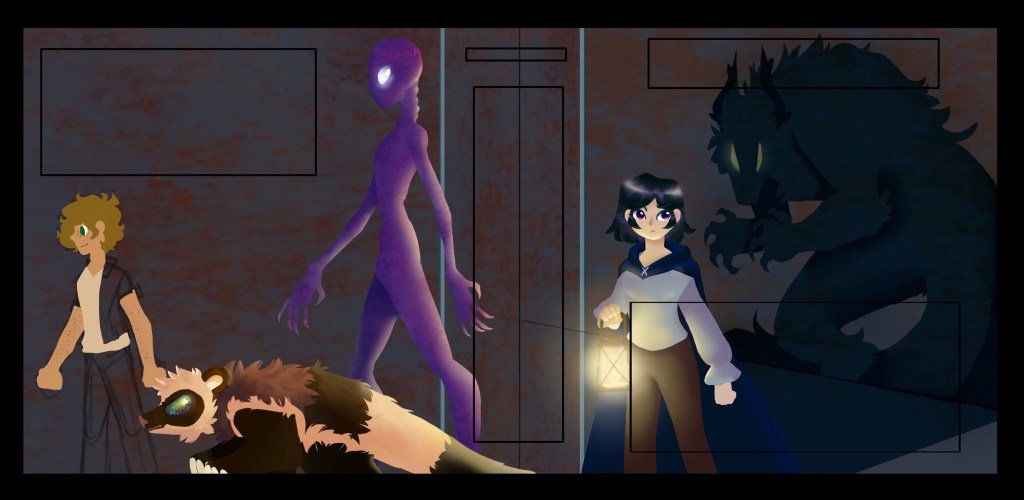 I’m also in the camp of authors who enjoy when artists put unique interpretations on things previously only represented in words, provided it stays true to the spirit of whatever is being visualized, of course. With Kraw above as an example—I think I only ever describe Kraw’s fur coat as shaggy and brown. Despite this, I think Eve’s addition of extra colors really works, in part because it is very true to real-world wolverines, one of the many inspirations that ultimately resulted in the kekeblin. The iridescent eyes with a shape kind of like a glare? I describe Kraw’s eyes as spheres, but this depiction still works because it catches his personality really well. I could come up with other examples of artistic license working within reasonable leeway, but you get the point.