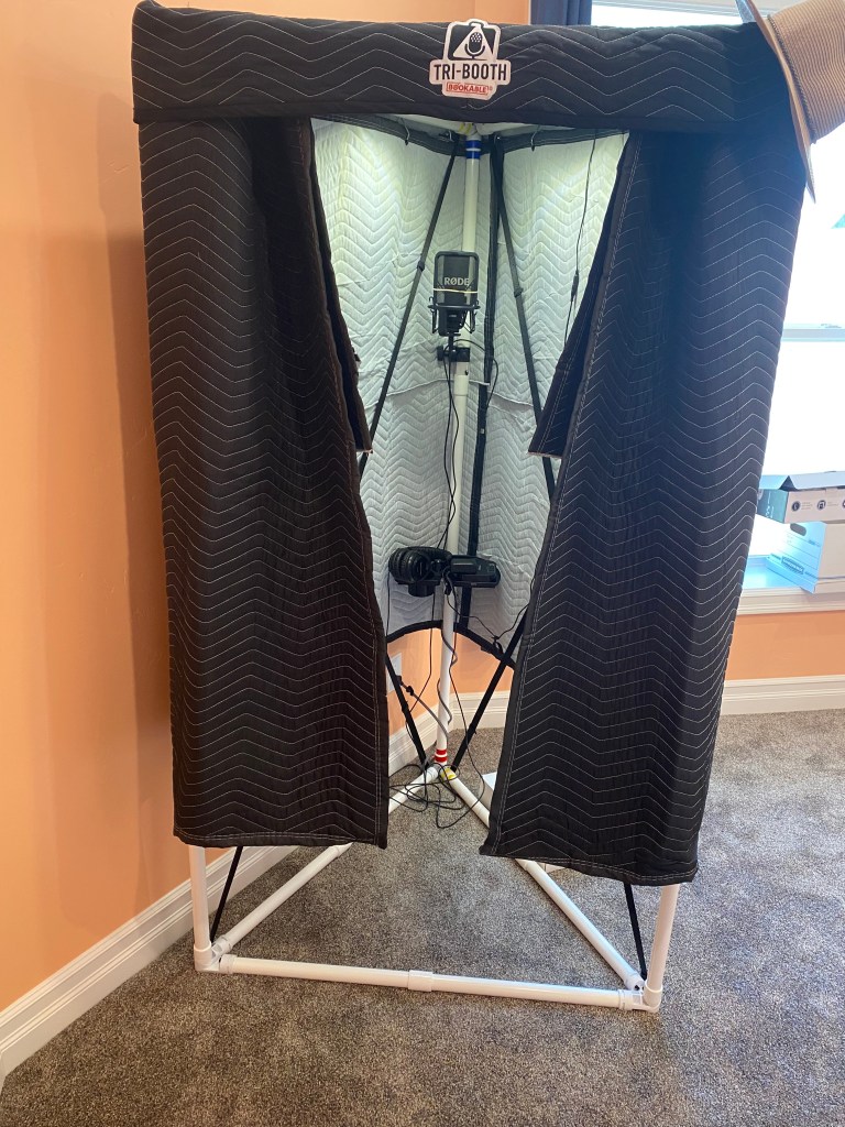 I use a Tri-Booth portable recording booth with a RØDE USB microphone and record the book myself. I use TwistedWave as the recording app on my laptop. It’s all set up in my at-home office. I hire my brother-in-law, an audio engineer, to do finalize the files after I record them.