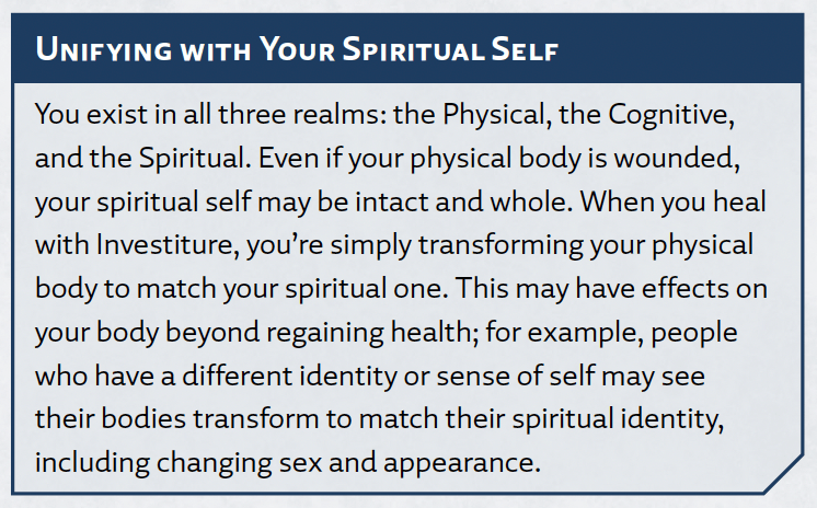 [When you heal yourself with magic, this] may have effects on your body beyond regaining health. For example, people who have a different identity or sense of self may see their bodies transform to match their spiritual identity, including changing sex and appearance.3
