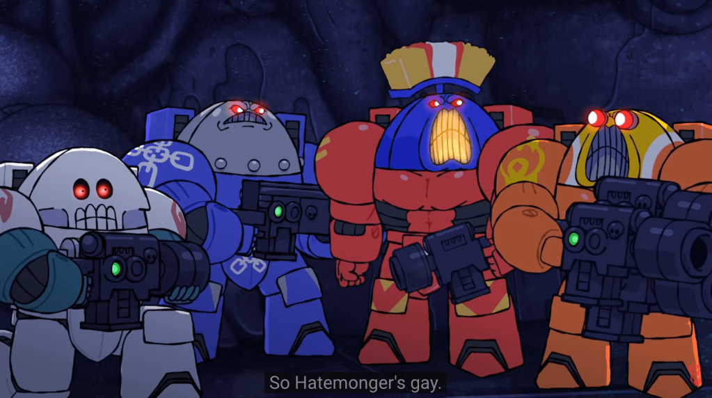 Space King is a independently animated sci-fi comedy TV series2 that lovingly parodies the Warhammer 40k universe while doing its own thing.3 The series so far consists of episodic misadventures, each of which focuses on one member of the core cast of four—Captain, Chestnut, and Bryce, in that order. Yes, I can count— only three episodes have been released so far, so presumably the fourth core character, Hatemonger (and Hatemonger’s Hate-Mace), will be the focus of the eventual fourth episode. The discussions of per capita will be glorious.