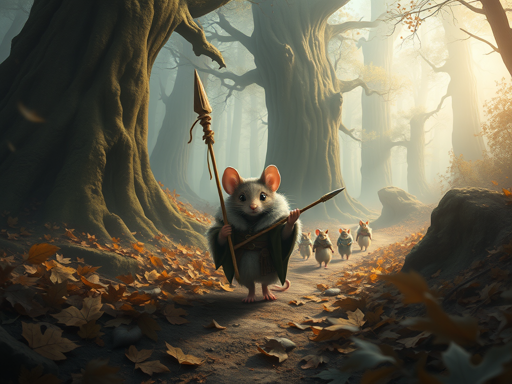 “Heart and heroism, Halfwhisker,” Pebble grunted. Pebble jerked her head the direction they had been travelling. “Sunrise soon. A little farther and we’ll have shelter. Not safe to pause here.” She turned her head to give Hazel a long look with her good eye, then hopped off, using her long spear as a walking stick. She was tailed by the band’s bloodskræcher, bundled in a thick cloak; the other mice surrounding Hazel followed, moving in single file.